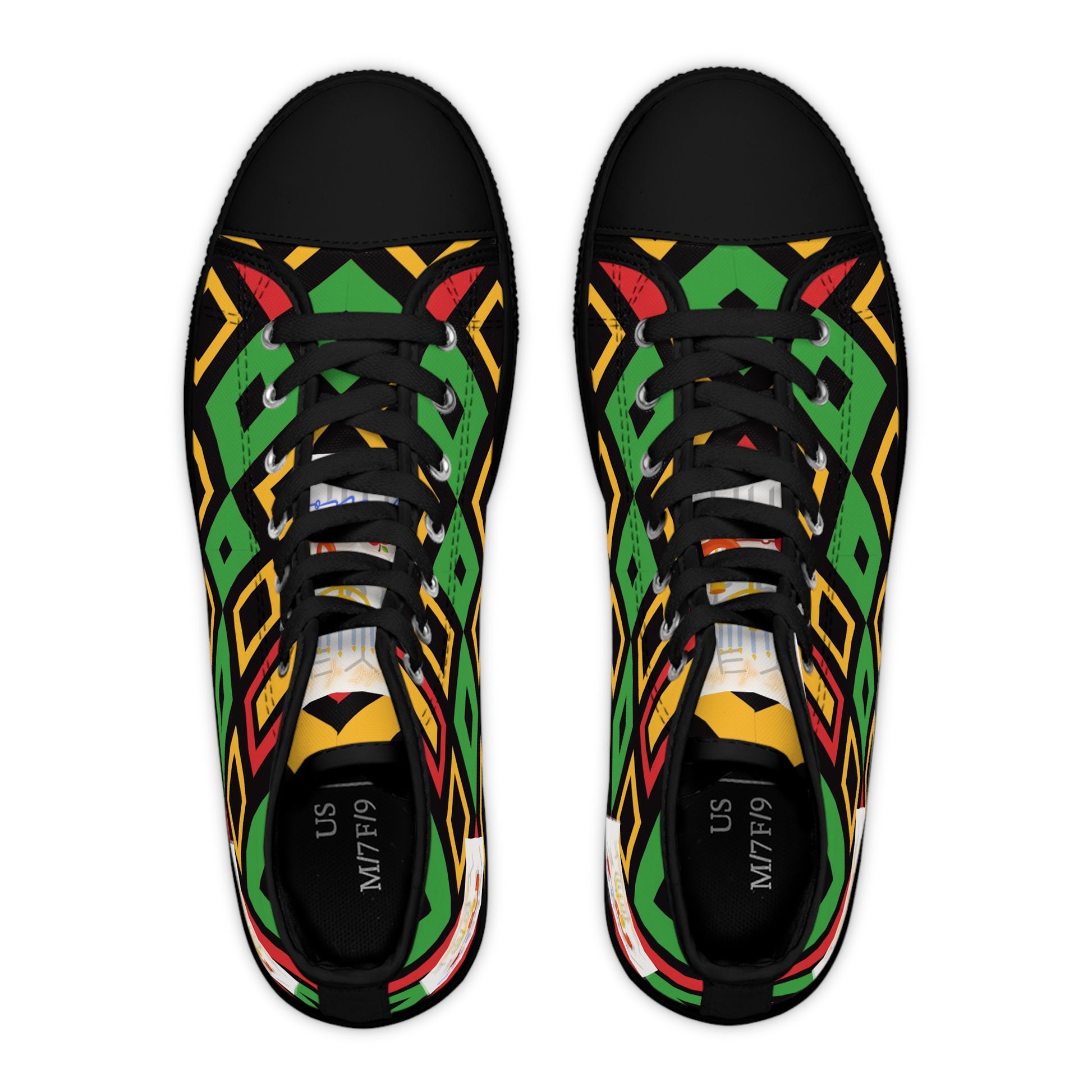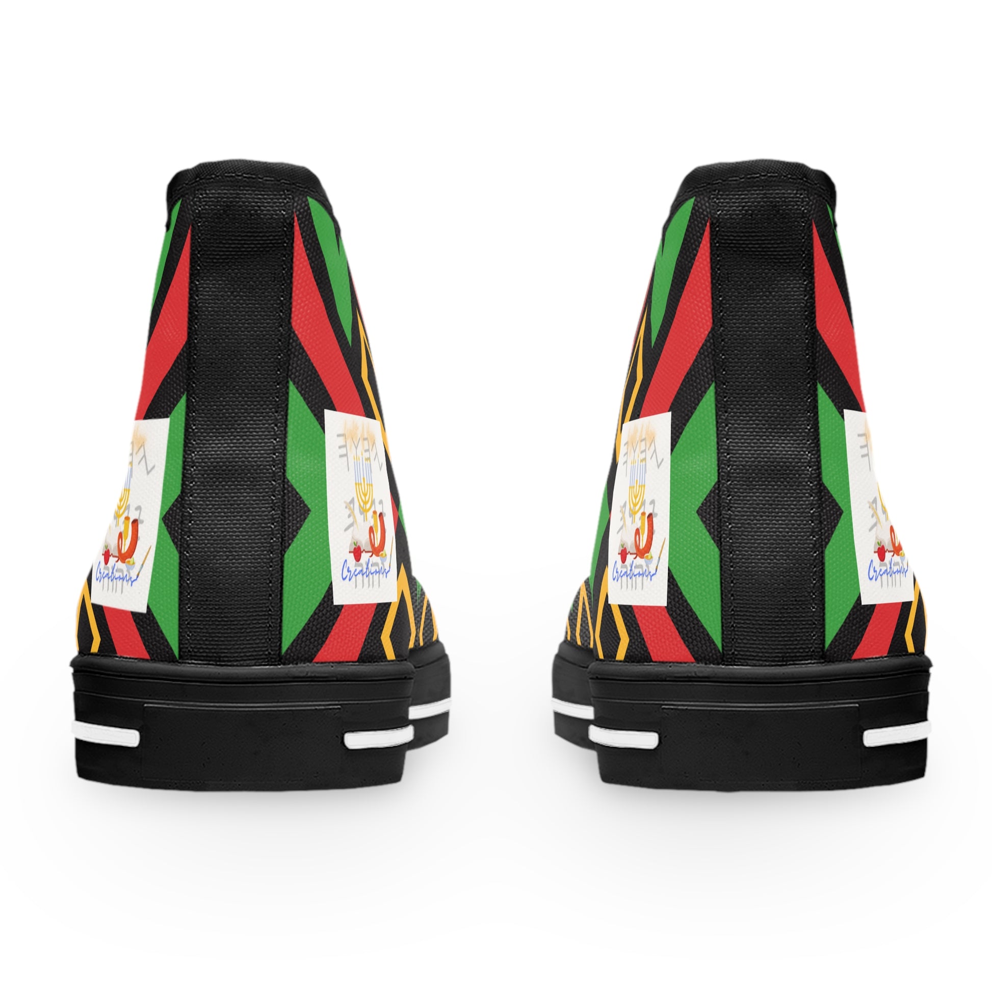 Step into style and comfort with these Women's High Top Sneakers. It has a beautiful Green Kente cloth pattern with the Light of Hope Creations logo on the sides and shoe tongue. It goes well on its own as well as with the Love Righteousness fits in the Apocryphal Collection. Designed to elevate your look these sneakers feature a vibrant full-wrap print that expresses your unique personality. Whether you're heading to a casual brunch, a lively festival, or simply enjoying a day out with friends, they offer that perfect blend of fashion and practicality. Ideal for trendsetters and comfort seekers alike, these sneakers can seamlessly transition from day to night. Perfect for birthdays, casual celebrations, or just as a treat for yourself, they make an excellent gift for anyone who loves to make a statement with their footwear.