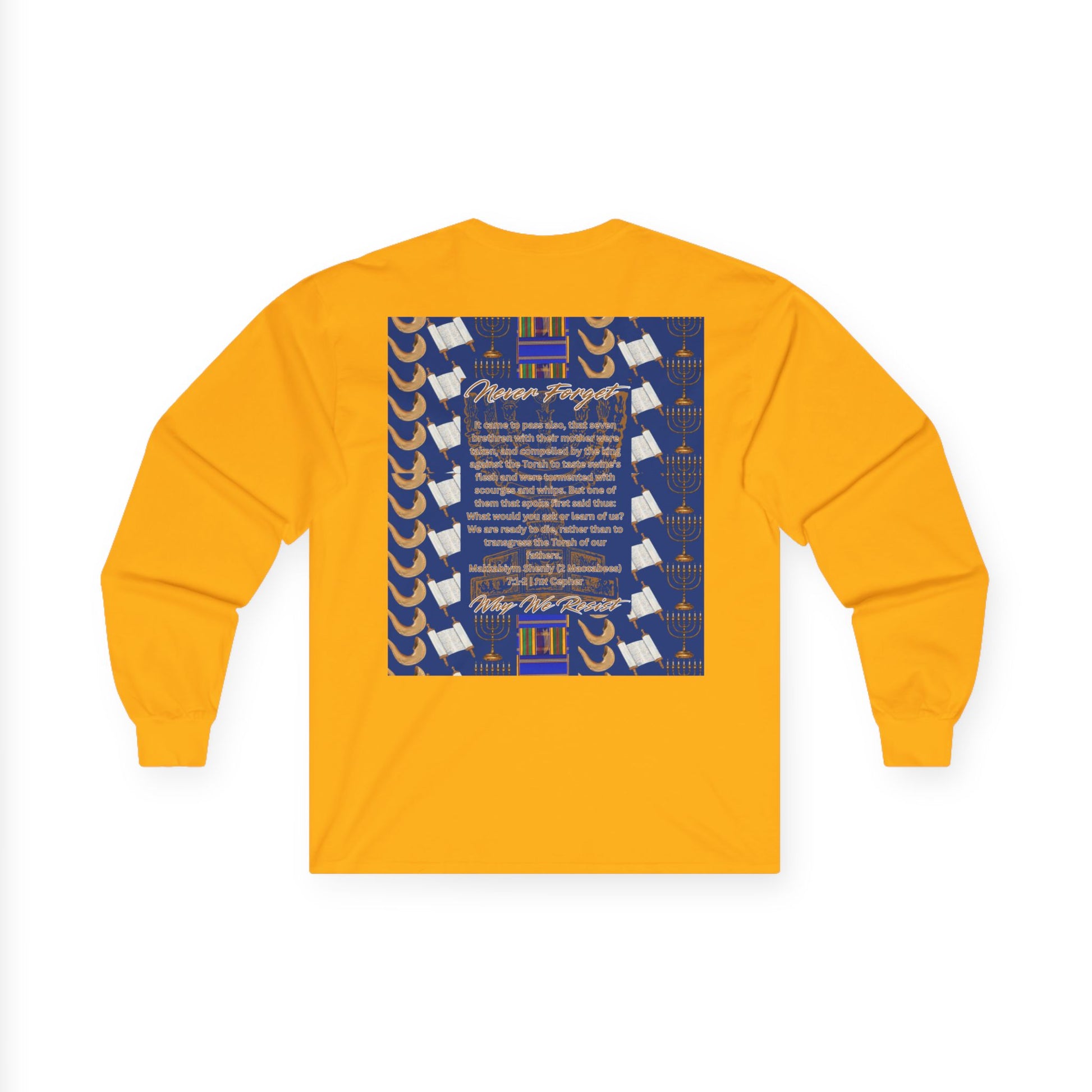 At the heart of the shirt, the powerful words of 2 Maccabees 7:1–2 are featured — a timeless passage of courage and devotion in the face of oppression. Framing the scripture are the stirring words: